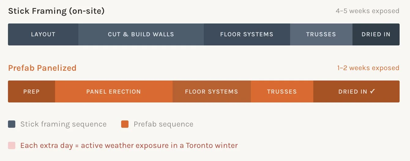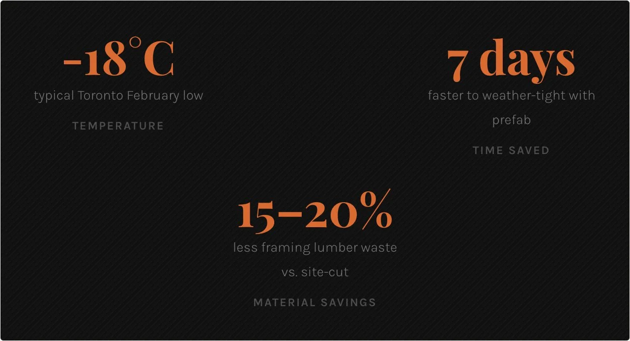 You're building in winter. The compressed erection timeline is the strongest argument for prefab in a GTA winter. The faster your structure closes, the better.